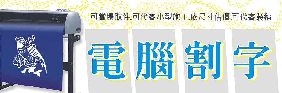 ~※價格依照割字尺寸與字數估算,歡迎來電或來信詢價!特色:1.可當場取件2.可代客小型施工3.依尺寸估價4.可代客製稿應 多種顏色可祧選,也可郵局寄送到府。